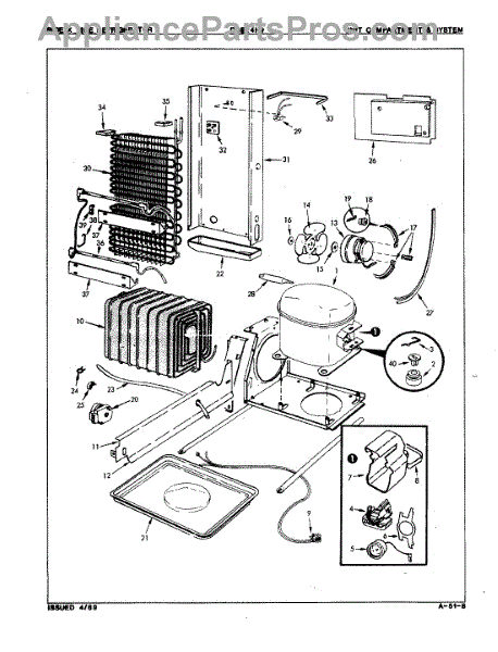 Plastic defrost pan. Evaporator pan hangs from side rails and rests on compressor.