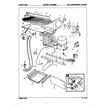 Plastic defrost pan. Evaporator pan hangs from side rails and rests on compressor.