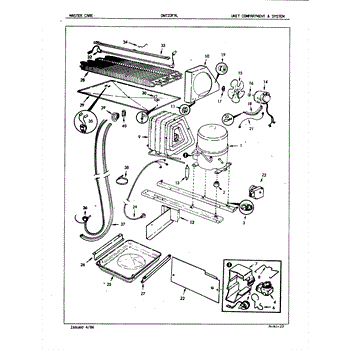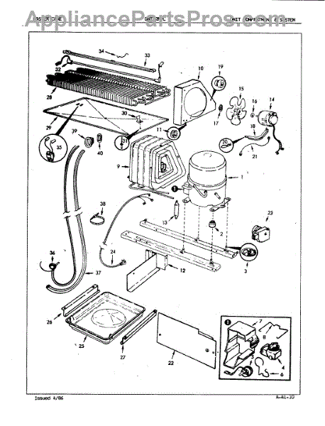 Plastic defrost pan. Evaporator pan hangs from side rails and rests on compressor.