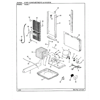 Plastic defrost pan. Evaporator pan hangs from side rails and rests on compressor.