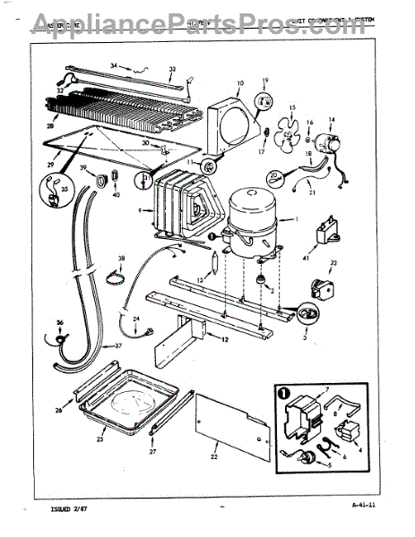 Plastic defrost pan. Evaporator pan hangs from side rails and rests on compressor.