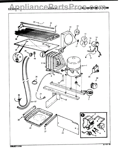 Plastic defrost pan. Evaporator pan hangs from side rails and rests on compressor.