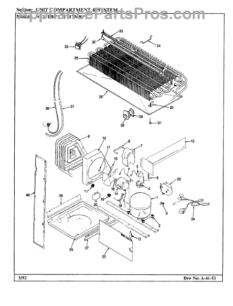 Plastic defrost pan. Evaporator pan hangs from side rails and rests on compressor.