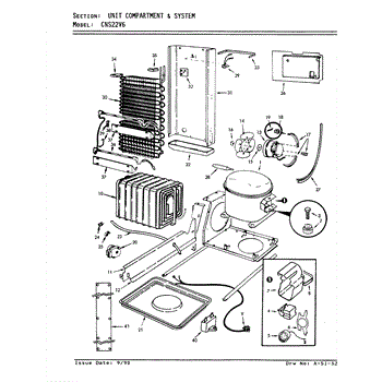 Plastic defrost pan. Evaporator pan hangs from side rails and rests on compressor.