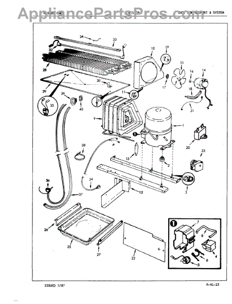 Plastic defrost pan. Evaporator pan hangs from side rails and rests on compressor.