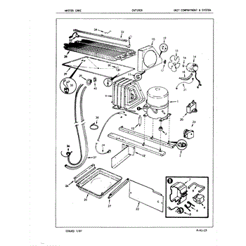 Plastic defrost pan. Evaporator pan hangs from side rails and rests on compressor.