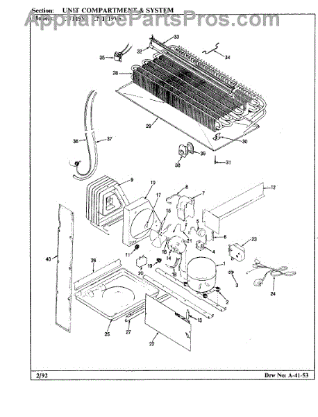 Plastic defrost pan. Evaporator pan hangs from side rails and rests on compressor.