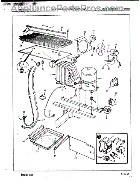 Plastic defrost pan. Evaporator pan hangs from side rails and rests on compressor.