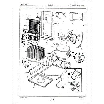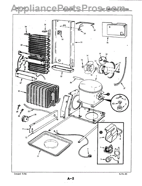 Plastic defrost pan. Evaporator pan hangs from side rails and rests on compressor.
