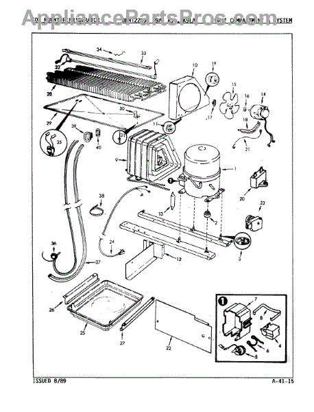 Plastic defrost pan. Evaporator pan hangs from side rails and rests on compressor.