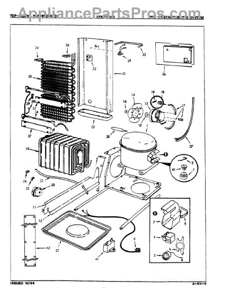 Plastic defrost pan. Evaporator pan hangs from side rails and rests on compressor.