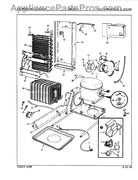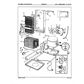 Plastic defrost pan. Evaporator pan hangs from side rails and rests on compressor.