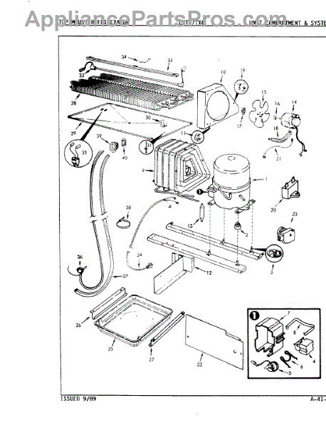 Plastic defrost pan. Evaporator pan hangs from side rails and rests on compressor.