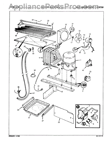 Plastic defrost pan. Evaporator pan hangs from side rails and rests on compressor.