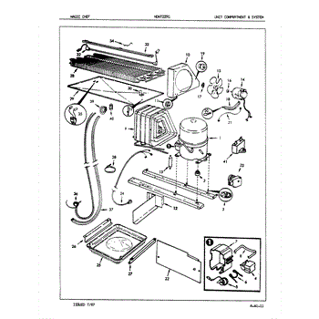 Plastic defrost pan. Evaporator pan hangs from side rails and rests on compressor.