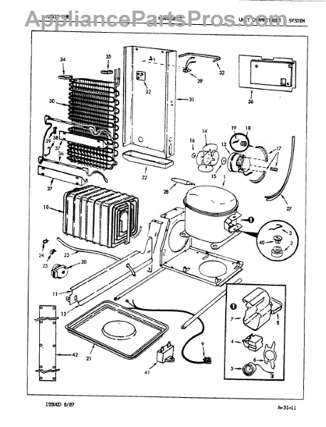 Plastic defrost pan. Evaporator pan hangs from side rails and rests on compressor.