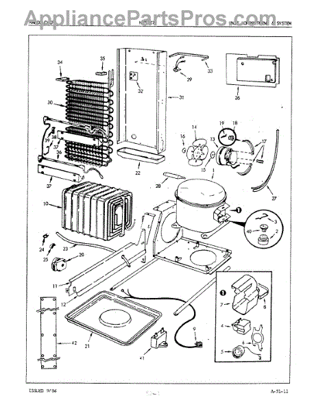 Plastic defrost pan. Evaporator pan hangs from side rails and rests on compressor.