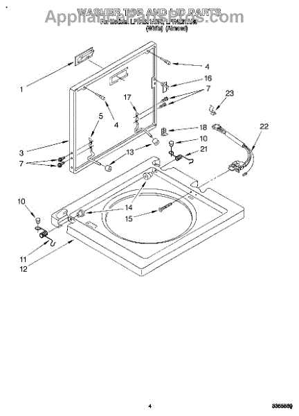 The Washer Lid Screw is an OEM part for Whirlpool washing machines. This 6-32 x .340 screw secures the washer lid to the hinge assembly, ensuring the lid opens and closes smoothly and stays securely in place during operation.