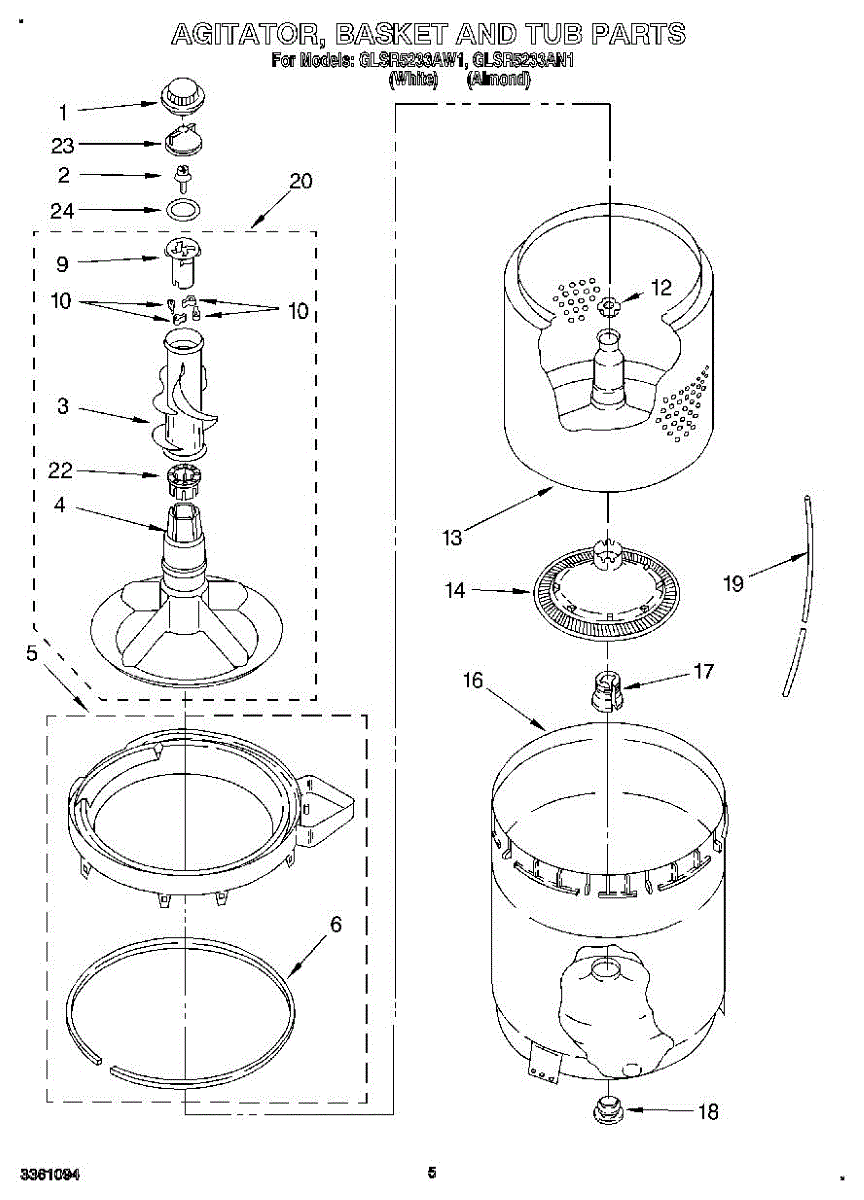 Inner tub basket holds clothing during wash cycles. Replace if cracked, rusty, or broken. Installs in center of washer between outer tub and agitator.