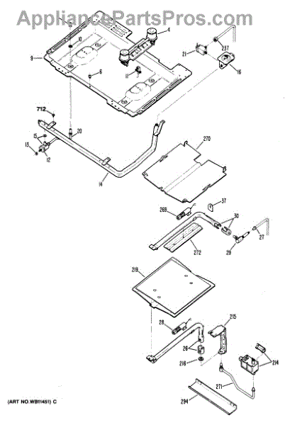This surface burner spark electrode creates the electric arc that lights the gas at the burner. Replacing a worn electrode restores consistent, reliable ignition.