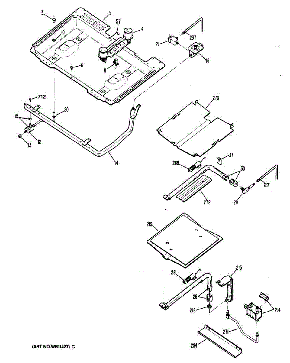 This surface burner spark electrode creates the electric arc that lights the gas at the burner. Replacing a worn electrode restores consistent, reliable ignition.