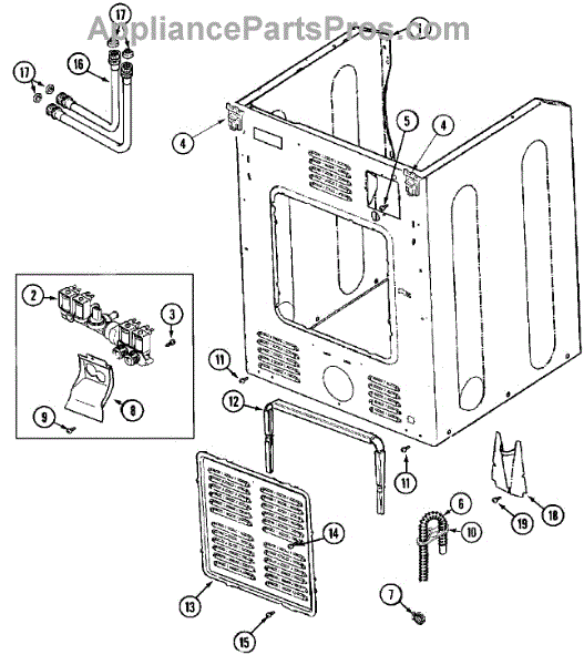 This small strainer sits inside the washer's water inlet valve and screens out sand, rust, and sediment from the supply lines. Replacing a clogged or missing screen restores normal fill flow and helps protect the valve.