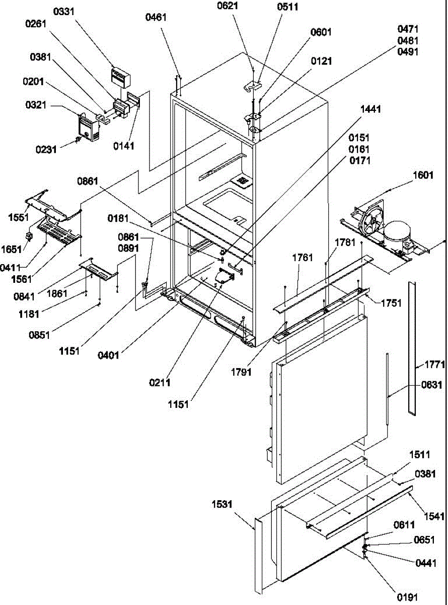 Mounting screw for refrigerator assembly. Secures components and panels in place. Replace if screw is stripped, missing, or no longer holding tight.