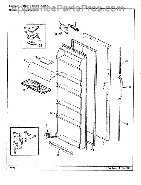 Washer for refrigerators. Installs between screws and mounting surfaces to distribute pressure and prevent damage. Replace if missing, worn, or cracked.