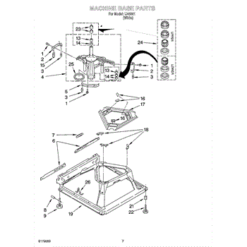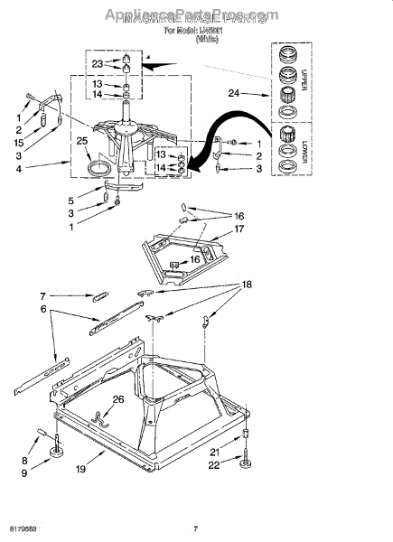 Used for direct drive washing machines. Complete assembly includes 2 level mechanism links, 1 level mechanism spring, 1 knurled pin, 2 rear feet, 1 pad plate, 1 suspension plate, 1 base pad, and 1 suspension spring retainer.