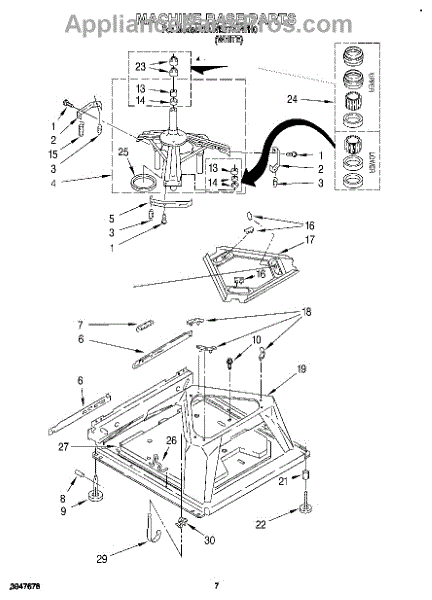 Used for direct drive washing machines. Complete assembly includes 2 level mechanism links, 1 level mechanism spring, 1 knurled pin, 2 rear feet, 1 pad plate, 1 suspension plate, 1 base pad, and 1 suspension spring retainer.