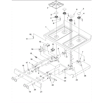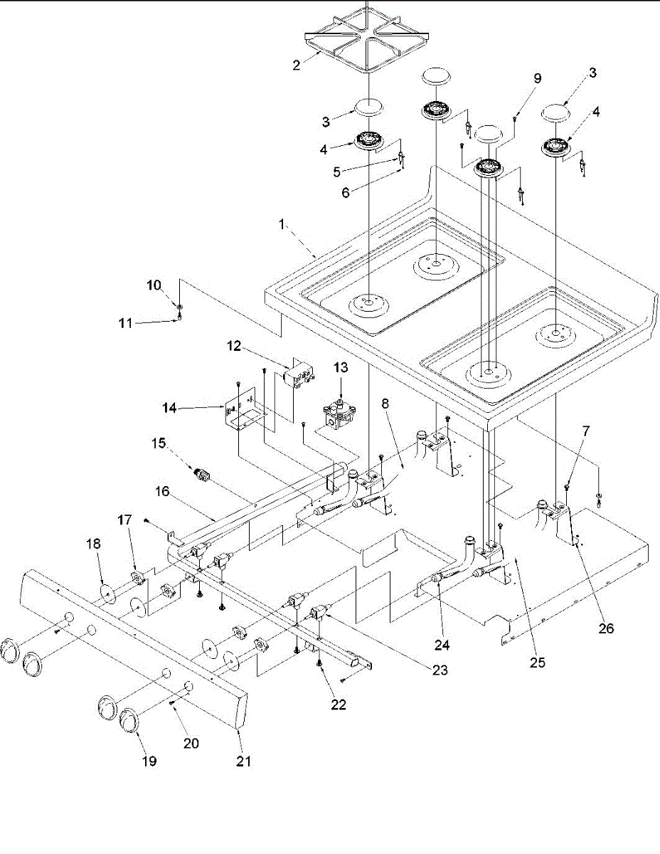Mounting screw for range burner base assembly. Secures burner components to cooktop surface. Replace if stripped, broken, or missing during repairs.