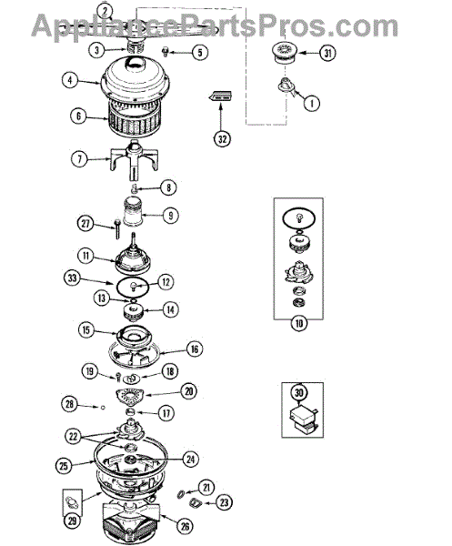 This dishwasher impeller assembly mounts on the circulation pump and pressurizes wash water for the spray arms. Replacing a worn or damaged impeller restores proper spray pressure, cleaning performance, and quieter operation.