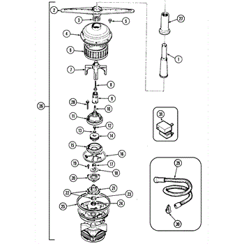 • Spins inside the wash pump to move water through spray arms; damaged fins reduce spray force and cleaning.