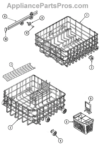This is an upper dish rack assembly for dishwashers. It is located in the top section of the dishwasher and is meant to ensure dishes stay in place while the dishwasher is running. The dish rack assembly is durable but can experience damage, stains, or other issues. This may make it unsuitable for holding dishes in the appliance. If the part is damaged or malfunctioning, it should be replaced with a new part.This is a simple replacement that takes only a few minutes to complete. First, open up the dishwasher. Remove the bottom rack if desired to create more room to work with the upper dish rack assembly. Take a small flathead screwdriver and use it to release the retaining tabs located on the stop clips. Remove the stop clips and the old dish rack assembly will slide out. Align the new assembly and slide it into place before reassembling other small parts.This upper dish rack assembly is used as an authentic OEM replacement part for dishwashers manufactured by Maytag, Norge, Jenn Air, Admiral, Amana, Crosley, and Magic Chef. The part is sold as an individual component.