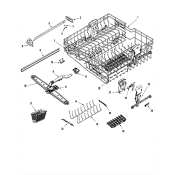 Upper dishwasher rack includes both adjusters and several accessories within the rack.