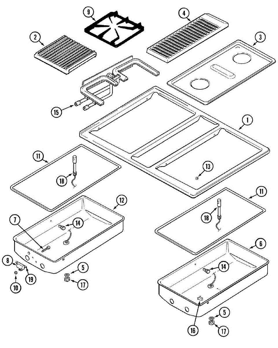 Drip pan installs beneath gas cooktop burners to catch spills and debris. Replace if cracked, chipped, discolored, or worn from regular use.