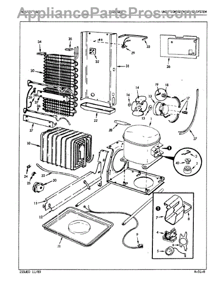 Plastic defrost pan. Evaporator pan hangs from side rails and rests on compressor.