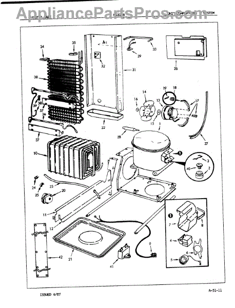 Plastic defrost pan. Evaporator pan hangs from side rails and rests on compressor.
