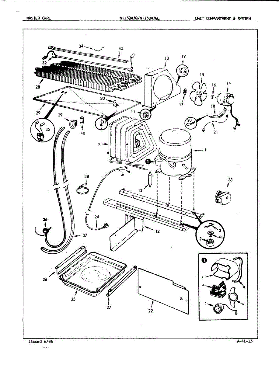 Plastic defrost pan. Evaporator pan hangs from side rails and rests on compressor.