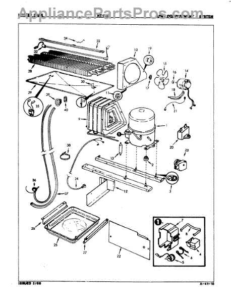 Plastic defrost pan. Evaporator pan hangs from side rails and rests on compressor.