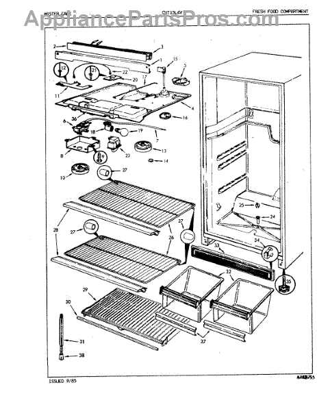 Plastic defrost pan. Evaporator pan hangs from side rails and rests on compressor.