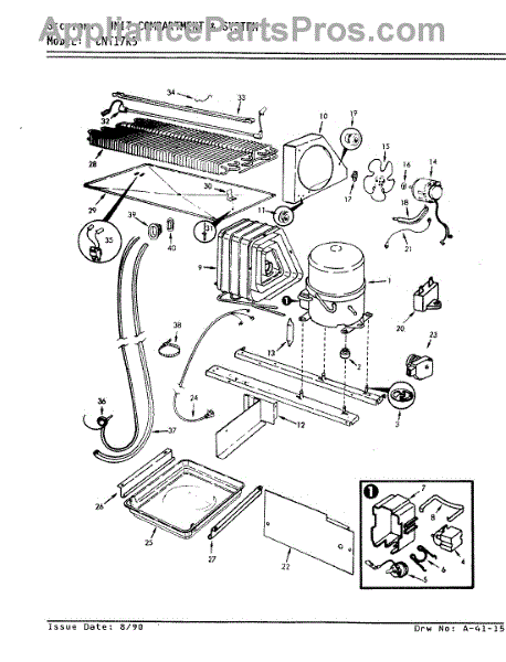 Plastic defrost pan. Evaporator pan hangs from side rails and rests on compressor.