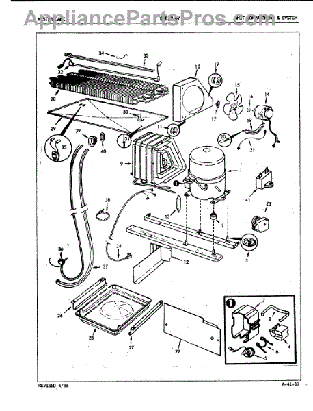 Plastic defrost pan. Evaporator pan hangs from side rails and rests on compressor.