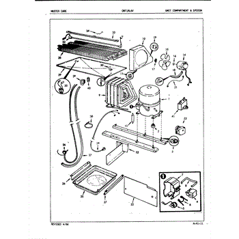 Plastic defrost pan. Evaporator pan hangs from side rails and rests on compressor.