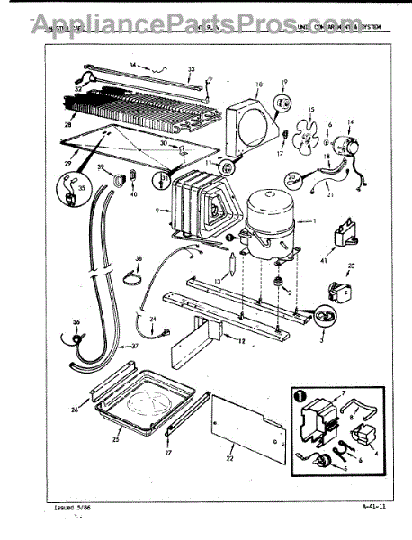 Plastic defrost pan. Evaporator pan hangs from side rails and rests on compressor.