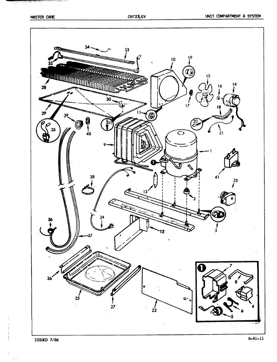 Plastic defrost pan. Evaporator pan hangs from side rails and rests on compressor.