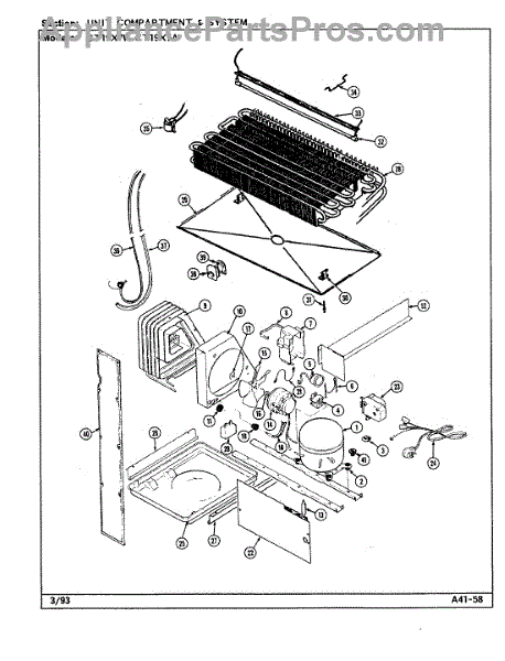 Plastic defrost pan. Evaporator pan hangs from side rails and rests on compressor.