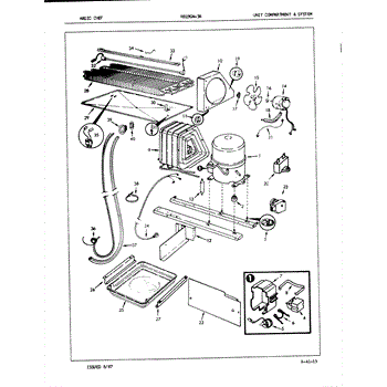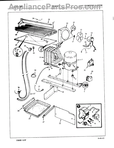 Plastic defrost pan. Evaporator pan hangs from side rails and rests on compressor.