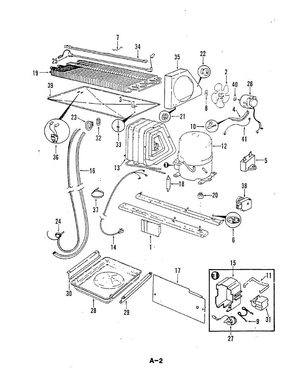 Plastic defrost pan. Evaporator pan hangs from side rails and rests on compressor.
