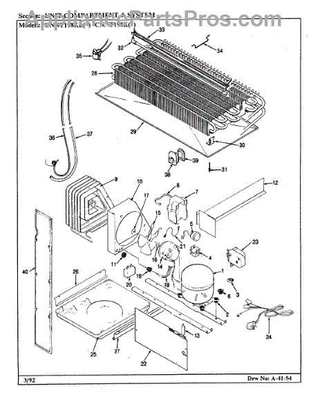 Plastic defrost pan. Evaporator pan hangs from side rails and rests on compressor.